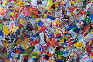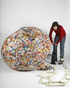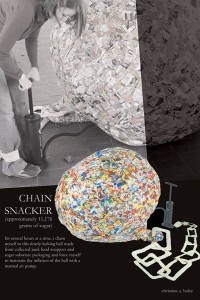Chain Snacker (approximately 11,176 grams of sugar), 2006, performance, 5’ sphere, Junk food wrappers, Splenda wrappers, vinyl, and air pump